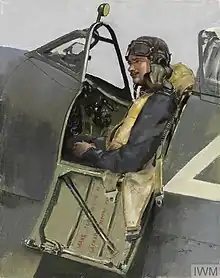 Portrait of James Hayter, sitting in the cockpit of a Supermarine Spitfire fighter, painted by William Dring in 1944