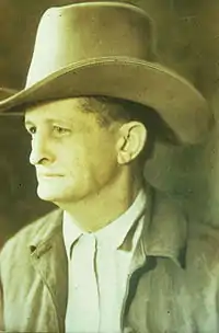 Jim White was born on July 11, 1882, on a ranch in Mason County, Texas.[1] He started working in the cattle business at a very early age and preferred it to the school his father forced him to attend.[2] He preferred "bustin' broncos to books and blackboards".[1] One day, when Jim had had enough of school, he begged his father to let him do something else. "I want to be a cowboy", he said.[2] So, when he was 10 years old, his father agreed to take him to the southeastern corner of the New Mexico Territory.[2] He left him at the ranch of John and Dan Lucas (XXX Ranch[1]).[2] His father bought land at Lonetree, just west of the developing town of Eddy (Carlsbad today), and moved the rest of the family there three years later.[2] Jim occasionally stayed at his family's small horse farm, but mostly lived and worked at the Lucas ranch.[2]