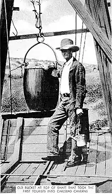 One of the early guano companies dug a shaft making a more direct route to the guano deposits in the Bat Cave.[2] It was serviced by a large iron bucket operated by a gasoline winch.[2] This system was used to haul bags of guano out of the cave for use as fertilizer in places like the California fruit orchards.[2] The guano was sold for 90 dollars a ton (2,000 pounds (910 kg)).[2] Jim White used the guano bucket to transport hundreds of tourists into and out of the cave.[2]