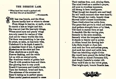 • 1888: The Deeside Lass, and Other Poems.[16] The long poem is the story of the laird’s son Donald who falls in love with the servant girl Jean who had been taken in as an orphan; the laird sees the virtues in Jean, but the laird’s wife is furious, and the pair run off.