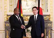James Marape (born 24 April 1971) is a Papua New Guinean politician who has served as the prime minister of Papua New Guinea since May 2019. He has been a member of the National Parliament of Papua New Guinea since July 2007, representing the electorate of Tari-Pori Open in Hela Province in the highlands. He has held Cabinet Posts as Minister of Education (2008–2011), Minister of Finance (2012–2019), and Minister of Foreign Affairs (2023–present).[1][2] Marape entered the 2022 elections under the banner of Pangu Party and won more seats than any other party. He was therefore entitled to form the government. His new government was elected unopposed by the new parliament.[3]