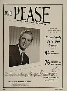 In August 1946 Pease took part in the US premiere of Peter Grimes, conducted by Leonard Bernstein at the Berkshire Music Center, Tanglewood: Pease, singing the role of Balstrode, was singled out as giving "[e]asily the most compelling performance on the stage ... [he] carried himself well ... and also sang eloquently".[4] Pease later sang in the US premiere of another Britten opera, Albert Herring, this time as the Vicar, Mr Gedge, in a production staged at Tanglewood on 8 August 1949, conducted by Boris Goldovsky.[5] With the Zurich Opera in 1961 he sang the priest Grigoris in the world premiere of Martinů's The Greek Passion.