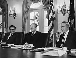 Secretary of Defense James R. Schlesinger with President Gerald R. Ford and Secretary of State Henry Kissinger during a briefing at The White House, November 1974.