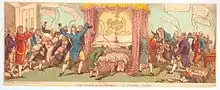 Satirical print from 1814, The Divine and the Donkey–or Petworth Frolicks against George (the Prince Regent) and James Stanier Clarke. A drunken parson is being put to bed with an ass-foal wrapped in a petticoat, a prank after celebrations of the battle of Leipzig. The parson is identified in the Oxford Dictionary of National Biography as Clarke:[1] he was being 'punished' for setting up an assignation with a servant-girl. The incident at Petworth House was real, but the presence of George seems to be fictional.