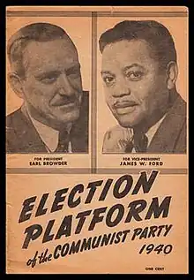 In the summer of 1935 Ford was sent by the CPUSA to the 7th World Congress of the Comintern as a delegate, where he was elected an alternate member of ECCI.[8] In 1936, Ford was nominated on the CPUSA's ticket as its vice presidential candidate, running this time with the CPUSA's General Secretary, Earl Browder.