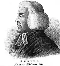 Wilmot's biography was written in 1813 by his niece Olivia Serres, who had lived with her bachelor uncle as a child. Serres claimed that Wilmot himself was a pseudonymous author, having written the Letters of Junius, well-known Whig political tracts which defended democratic rights and freedom of speech, whose authorship had been much debated.[10] Serres also asserted that Samuel Johnson admired Wilmot to such a degree that he "submitted his writings to the perusal of Dr Wilmot before their going to the press",[10] and that he was close to the poet laureate Thomas Warton, with whom he exchanged poems. Serres also said that Wilmot knew the novelist Laurence Sterne and influenced leading liberal political figures including John Wilkes and Edmund Burke.