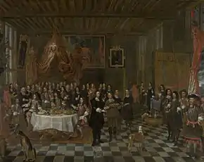 Van Meunincxhove painted two remarkable paintings documenting events which occurred during the residence in Bruges of Charles II of England and his brothers Henry Stuart, Duke of Gloucester and James Stuart, Duke of York in the period from 22 April 1656 to 15 March 1659. On 2 October 1656 the King and his brothers visited the Bruges Guild of the 'Kolveniers' (Guild of Harquebusiers) where the Duke of York successfully shot the target (a parrot). This was cause for great celebration among the local population and was immediately recorded in a poem by Ingelbrecht Cockuyt of the Bruges Chamber of Rhetoric. Van Meunincxhove remembered the same event about 15 years later in two works that were destined for the new premises of the Guild of the Kolveniers (both now in the Groeningemuseum). One of the compositions depicts the celebration meal and the other the King and his retinue in the 'Hoveningen', the walled garden of the Guild. In the second picture depicting the Hoveningen, van Meunincxhove follows the style of genre paintings developed in Flanders after 1660 by artists such as Gillis van Tilborch: he depicts the two groups of three persons on the left foreground on a small scale while the persons surrounding the King have an abnormally long leg which serves to pull the viewer into the depth of the composition. The fabric of the clothing is rendered in rich detail while the artist also depicts some anecdotic details such as the children who climb the wall to better view the event. The second painting depicting the celebration meal includes a representation of the painting of the Hoveningen.[6]