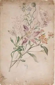 Study in pencil and watercolor of the Papaver somniferum and specimens of the Alstroemeria, Gypsophila and an unidentified plant, neither with monogram nor signed, probably about 1865