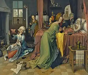 Jan de Beer's work shares the characteristics of the work of the other representatives of Antwerp Mannerism. Like them, Jan de Beer and his workshop painted religious works and altarpieces. A majority of the works deal with scenes related to the Nativity of Jesus by night and the Adoration of the Magi.[8] While the Antwerp Mannerists often used standardised models in their works, Jan de Beer demonstrated that it was still possible to achieve a high level of individuality within these conventionalized forms. His work distinguishes itself through its refined colourism and emotional and psychological depth.[3] Friedländer identified several characteristics of de Beer's style such as Gothic architecture, draped curtains, billowing figures and robes that spread out to the ground or end in points.[4]