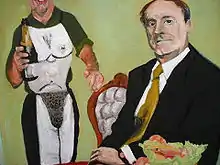 In August 2007, she appeared in the documentary, The Daily Mail Diet, on Al Gore's Current TV internet video site, where she showed a painting of Daily Mail editor, Paul Dacre behind a prawn cocktail, which Kelly said represented "a little bit of taste, but very predictable, bland and no surprises—it's from a different age where people had a more limited palate", and that she had depicted him as a stern figure as he "loves the 50s he wants people to go back to a time of discipline".[7] She explains the other figure in the painting: "The Mail has always been slightly prurient and a bit scared of sex and I wanted this figure to represent that—it's slightly nasty and a bit threatening."[7] The documentary, on the same principle as the film Supersize Me, showed film maker Nick Angel consuming only one news product—the Daily Mail—for four weeks,[8] a diet, which Kelly considered, "dangerous—it would be like eating hamburgers and nothing else—you're starving yourself."[7] The Guardian challenged Daily Mail journalists to print out her picture and post it on the newsroom wall.[7]