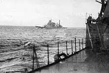 It was discovered after the end of the war that Takao was manned by a skeleton crew and had no ammunition aboard for her 8-inch main armament.[4] Japanese forces surrendered Seletar Naval Base to the British on 21 September 1945. On 27 October 1946, Takao was towed to the Strait of Malacca and was sunk as a target ship by the light cruiser HMS Newfoundland on 29 October 1946 at 03°05′05″N 100°41′00″E / 3.08472°N 100.68333°E.[4] She was removed from the navy list on 3 May 1947.