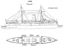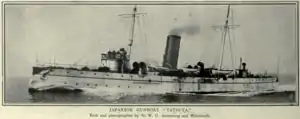 Rushed through production due to the impending First Sino-Japanese War, Tatsuta was en route to Japan when hostilities commenced, and she was impounded in the port of Aden on 28 August 1894 by British authorities, as the United Kingdom took an official position of neutrality in that conflict. She was not allowed to reach Japan until 19 March 1895, after the war was over.[2] On 21 March 1896, Tatsuta was re-classified as a dispatch vessel. In 1900, she was assigned to assist in escorting transports supporting Japanese naval landing forces which occupied the port city of Tianjin in northern China during the Boxer Rebellion, as part of the Japanese contribution to the Eight-Nation Alliance.[3] In 1902, she underwent overhaul at Kure Naval Arsenal, where she became the first vessel in the Japanese navy to have her locomotive-type cylindrical boilers were replaced with high pressure Niclausse boilers.[4]