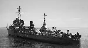She was subsequently reassigned to Maizuru for use as a training and guard vessels. On 30 July 1945, Hatsushimo struck an air dropped naval mine while under attack from United States Navy aircraft from TF38 at Miyazu Bay, forcing her crew to beach her at 35°33′N 135°12′E / 35.550°N 135.200°E. The attack killed 17 crewmen. Hatsushimo was the 129th and last destroyer of the Imperial Japanese Navy to be lost during the war.[9][11]