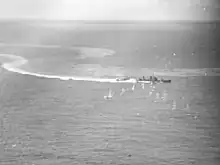 The Japanese approached the island early on the morning of 11 December, and the warships began to bombard the island at a range of 8,200 meters (9,000 yd) at 05:30. As none of the six American 5-inch (12.7 cm) coast-defense guns replied, Rear Admiral Sadamichi Kajioka, commander of the invasion forces, ordered his ships to close the island, believing that the American guns had been destroyed by the earlier aerial attacks. Encouraging this, Major James Devereux, commander of the United States Marine garrison, had ordered his men to hold their fire until he gave the order to do so. After the Japanese ships had closed to a range of 4,100 meters (4,500 yd), he ordered his guns to open fire. They did so with great effect, sinking Hayate, near-missing Kajioka's flagship Yubari, and causing to him to order his forces to disengage.[8] Oite was slightly damaged by near-misses that also wounded 14 crewmen. The ship returned on 23 December with the second (and ultimately successful) Wake Island invasion force before returning to Kwajalein.[7]