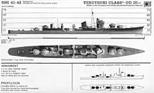 Teruzuki returned to Truk on 18 November and briefly became the flagship of Kimura's Destroyer Squadron 10. She was slightly damaged when she struck a reef at Truk on 3 December. This was quickly repaired as the ship departed for the naval base in the Shortland Islands two days later. Upon her arrival on 7 December, Teruzuki became the flagship of Rear Admiral Raizō Tanaka, commander of Destroyer Squadron 2.[9] By this time the Japanese were forced to deliver supplies to its troops on Guadalcanal via water-tight drums that depended on the currents to take them to their destination. On 11 December Tanaka assembled a convoy of five destroyers carrying drums that was escorted by five additional destroyers as well as Teruzuki. Enroute the convoy survived an attack by 14 Dauntless dive bombers without damage and dropped off their drums without further incident. The convoy turned for home at 01:15 with Teruzuki covering their withdrawal, moving at a speed of 12 knots (22 km/h; 14 mph) near Savo Island. Shortly afterwards, the destroyer was attacked by two or three PT boats;[Note 1] Teruzuki was hit by a single torpedo in the stern. The detonation broke the rudder and one propeller shaft, disabling the ship, while rupturing an oil tank that caught on fire. Tanaka was knocked unconscious by the detonation and was transferred to another destroyer at 01:33, as were some of the crew. The fire could not be controlled and caused the aft depth charge magazine to explode at 04:40, sinking the ship. Nine men were killed, but the destroyers Naganami and Arashi rescued 197 crewmen between them. An additional 156 men were able to swim to Guadalcanal.[19] Teruzuki was stricken from the navy list on 15 January 1943.[9]