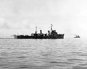 Tsuta (Ivy)[5] was ordered in Fiscal Year 1943 under the Modified 5th Naval Armaments Supplement Program as part of the Matsu class, but the design was simplified to facilitate production and the ship was one of those built to the modified design.[3] She was laid down on 31 July 1944 by Yokosuka Naval Arsenal, launched on 2 November and completed on 8 February 1945.[6] The ship was assigned to the 11th Destroyer Squadron of the Combined Fleet for working up, and was briefly attached to the Second Fleet on 1–20 April. Tsuta was transferred to Destroyer Division 43 of Escort Squadron 31 of the Combined Fleet on 25 April. Five days later the ship was moored and camouflaged in the Seto Inland Sea. She was turned over to Allied forces at Kure at the time of the surrender of Japan on 2 September and was stricken from the navy list on 5 October.[5]