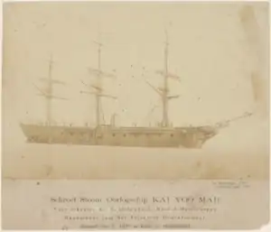 Kaiyō Maru was ordered in 1863, and built by Cornelis Gips and Sons, at Dordrecht, Netherlands, for a sum of 831,200 guilders.[1] Her construction was overseen by a Japanese military mission under Uchida Masao and Akamatsu Noriyoshi.[2] She was launched in October 1866,[3] and anchored before Vlissingen on 23 October.[4] Kaiyō Maru arrived in Japan in November of the same year.[5] She was the largest wooden warship ever built by a Dutch shipyard at the time.[6] She was 240 feet (73 m) long.[1]
