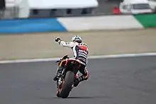 Dani Pedrosa celebrating after winning the 2011 Japanese GP on his Honda RC212V