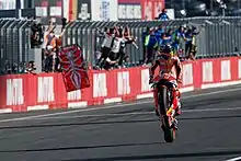 Marc Márquez riding his Honda RC213V while crossing the finish line first at the 2018 Japanese GP
