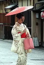 All six cover sleeves for Japonesque were photographed by photographer and designer Kazuyoshi Shimomura.[3][15][16][17][18][19] The standalone CD has a close-up of Koda looking down to the camera, holding a cigarette holder.[3] The CD and DVD format has a long shot of Koda sitting on a chair with different flowers sitting on the head piece.[15] The three limited edition box set cover sleeves are similar images with different poses; the first box set has Koda standing in front of a wall with Japanese design; Koda is holding a traditional Oil-paper umbrella and is dressed in a pink kimono.[16] The second box set artwork has Koda facing towards the camera, similar to the previous box set.[17] The only change in the third box set artwork is that Koda is seen without holding the umbrella.[18] The digital release uses the first limited edition box set artwork.[19] The booklet and photo shoot were designed by Japanese designer Jun Hirota, and the design was based on traditional Japanese culture and the emphasizing of geisha art.[3][13][15][16][17][18][19][20] The photo album that came with the second limited edition box set features a 28-page spread, featuring different images from the Japonesque photo shoot.[17]