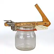 A jar opener is a kitchen device which is used to open glass or plastic jars. A jar is sealed by either (a) a screw-off rubberised lid or (b) a lid placed on the opening of the jar with a rubber sealing-ring between. Screw-off lids are usually made of metal with a thin rubber sealing layer, whereas lift-off lids mostly consist of glass.