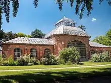 Today the garden contains a rose garden (80 varieties), fragrance garden, collection of grasses, flower beds, and a mature arboretum with Aesculus flava, bald cypress, Diospyros virginiana, Fagus sylvatica asplenifolia, ginkgo, Melia azedarach, sequoia (140 years old), and Sophora japonica, as well as a large stand of hardy bamboo (Phyllostachys aurea). Its 1,000 m2 (11,000 sq ft) greenhouses contain about 4,500 plants representing 80 botanical families, including orchids, cacti, and palms.