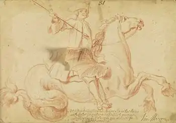 The service in the cavalry was generally a badge of high-ranking social status not least because of the high costs caused by maintaining the cavalry horses and the keeping of a groom which had to be borne by each cavalryman himself.[81][82] All metal parts of a cavalry officer uniform had to be gilded.[83] For these reasons the Hanseatic cavalry was the stomping ground for the grand burghers.[80]