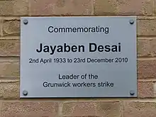 Jayaben Desai (2 April 1933 – 23 December 2010) was an Indian-born trade unionist in the United Kingdom. She was noted as a prominent leader of the strikers in the Grunwick dispute in London in 1976.[1]