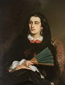 Portaels was in demand as a portrait painter and also received many orders from the Belgian state and religious institutions, including the frescoes decorating the old Chapel of the Brothers of Christian Doctrine for which he used the innovative water glass technique.[3] He was commissioned in 1850 to provide the decoration of the external pediment of Saint Jacques-sur-Coudenberg, the church of the royal parish. This showed the high esteem in which he was held by the Belgian royal family. He became a familiar visitor of the Royal Palace since the time of the first king of Belgium Leopold I. In 1857, he attended the betrothal of Princess Charlotte. The following year, he was asked to paint portrait of the two princes and, in 1862, he served as a mentor to Prince Philippe, Count of Flanders. He also acted as an art advisor for the latter and assisted him with the selection of art works for the decoration of his palace in Brussels. After the accession to the Belgian throne of Leopold II in 1865 he served also artistic advisor to the king and was often admitted - like other Belgian artists such as the painter Ernest Slingeneyer and the sculptor Thomas Vinçotte - at the dinner table of the king. He taught art classes to Queen Marie-Henriette. His work was well represented in the royal collections. At the same time he portrayed many members of the bourgeoisie and the Belgian aristocracy.[7]