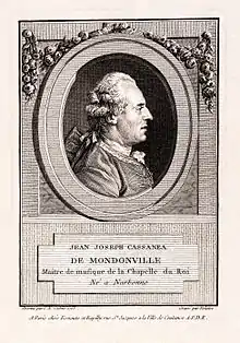 Jean-Joseph de Mondonville (French pronunciation: [ʒɑ̃ ʒozɛf mɔ̃dɔ̃vil], 25 December 1711 (baptised) – 8 October 1772), also known as Jean-Joseph Cassanéa de Mondonville, was a French violinist and composer. He was a younger contemporary of Jean-Philippe Rameau and enjoyed great success in his day. Pierre-Louis Daquin (son of the composer Louis-Claude Daquin) claimed, "If I couldn't be Rameau, there's no one I would rather be than Mondonville".[1]