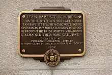 Beaubien died there at some time in January 1863 or 1864. The Chicago History Center has an 1825 portrait of Beaubien, as well as some of his papers which survived the Great Chicago Fire.[35][36] A small Chicago street near the lakefront, "Beaubien Court" is named after the founder and gave access to the Illinois Central Railroad's freight warehouses.[37] The downtown Chicago historical marker shown above was erected in 1937 as part of the centennial of Chicago's charter,[38] The Chicago Public Schools named a north side elementary school to honor Beaubien.[39] The Cook County Forest Preserve District named 279 acres with access to the Little Calumet River and the man-made 19 acre Flatfoot Lake on the south side near the Bishop Ford Freeway "Beaubien Woods."[40]