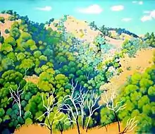 The images represent the diversity of the Australian landscape and include "the filmy veil of greenness' seen from Isherwood's own window, a flood on the Darling River, a bushfire in the Blue Mountains and a forest of ringbarked trees near Armidale. This latter painting is one of Isherwood's most masterly works, showing her exceptional control over both the watercolour technique and perspective. As is usual in a watercolour, those parts of the painting which are white are left unpainted, in this case a forest of dead tree trunks. In the narrow spaces between the array of trees Isherwood has painted a landscape that rolls away in layers to the distance. The subject would have been impressive, in oils. In watercolour, however, the technical demands are extraordinary, as is the facility with which it has been achieved. The paintings were eventually put on permanent display in the Gunnedah Bicentennial Regional Gallery. Isherwood set about painting a series of oils based on the watercolours. These were exhibited at the Artarmon Galleries in Sydney in 1986.
