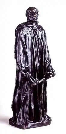The first such study of d'Aire was nude, followed by one partially covered in a kind of toga and with the noose round his neck more obvious. He holds a cushion bearing the keys of Calais and is drawn to the left by the noose. A bronze cast of this second version is now in the Museo Soumaya in Mexico City and other collections.[1][2]