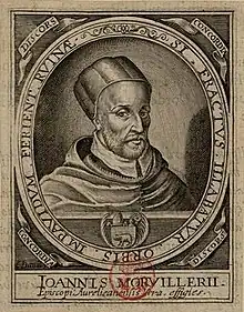 In 1551 he conducted his first diplomatic mission in England, assisting in the negotiation of the Treaty of Angers on 19 July 1551, that fostered an entente between the countries.[6] In 1552, Morvillier became bishop of Orléans. This was not without dispute with the local chapter which objected to the presence of his beard, asserting that this was an indication of a worldly man. Morvillier appealed to the king who informed the chapter that his beard was necessary as he would be conducting worldly matters through his involvement at court.[7] Morvillier's ascent to the bishopric of Orléans was a political move by the king to reward one of his officers for the service rendered to him.[8] While now bishop of Orléans, he would not take possession of his bishopric until 1559, and in the intervening period entrusted stewardship of the See to three vicars.[2] In 1563 he resigned from control of the See in favour of his nephew Mathurin de la Saussaye.[9] Though an absentee bishop, he was not insensitive to his See, and had organised pastoral matters there occasionally.[10]