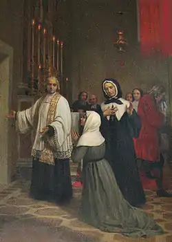 On 24 June 1685 she took a simple vow of perpetual seclusion, chastity, and poverty. Her spiritual directors, François Dollier de Casson and Seguenot, encouraged her to continue her pious observances. Her poverty and seclusion, however, were somewhat tempered by the fact that, befitting her social rank, she retained throughout her years of withdrawal from the world an attendant, her cousin Anna Barroy, who saw to her physical requirements and accompanied her to mass. Jeanne sewed and embroidered church vestments, made clothing for the most needy and provided for the schooling of disadvantaged young women.[2]