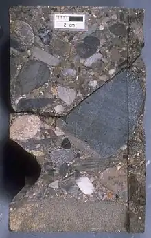 The upper crust beneath the wide shoals of the Grand Banks region is composed of old Precambrian and Paleozoic strata that were moderately deformed by compression during the collisions of ancient continental plates during final assembly of the super-continent Pangea in Devonian to Carboniferous times.[3][4] Later, these old 'basement' rocks were subjected to multiple episodes of stretching during the Mesozoic and the strain of that extension was expressed in growth of large rips in the rock fabric known as faults. The crust was thinned in areas of stretching and the synchronous growth of faults allowed those areas to subside; that is, to sink relative to surrounding areas, thereby creating rift basins. The Jeanne d'Arc Basin is one of these areas of rift subsidence that is bounded and transected by extensional faults which record the plate tectonic history of the North Atlantic region.[5][6]