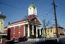 The first courthouse on the site was built in 1803 on a lot donated by Charles Washington, but was destroyed in a fire. Its replacement, the core of the present courthouse, was built in 1836–37 with its present Doric pedimented porch. During the American Civil War the courthouse was heavily damaged by cannon fire and was salvaged for metal. Was it torn down?[4] From 1865 to 1872 the courthouse was vacant, and court was held in Shepherdstown at McMurran Hall. In 1871–72 the building was reconstructed to a design by Phillips and Cockrill, keeping the façade, but little else. A disproportionately large cupola was added for the town clock on top of the porch at this time. In 1910 Alfred B. Mullett designed an extension to the rear, with a later Georgian Revival addition comprising a jail and sheriff's offices.[3]