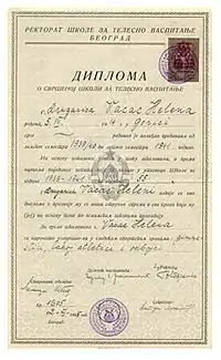 Vazzaz completed all her primary schooling but was delayed by a year from entering teachers’ college due to being born 2 months too late into the year. When she finished school at the Ljubljana Teachers' College in 1934, her political associations with the Sokol Society led to her having to wait four years for a full-time job. At that time, she worked part-time at a classical grammar school, and at the same time at the Poljane Grammar School. In 1938, she got her first job in Dolenjska as a subject teacher at the primary school in Trebelno nad Mokronogom from which she was transferred to the primary school in Doljni Karteljevo in 1941, where she was acting school principal.[1]:11 In 1939, the first higher school for physical education in the Kingdom of Yugoslavia opened in Belgrade, which she really wanted to attend. Her mother Terezija sold all her jewelry, determined that Jelica would be able to afford to pursue the higher educational opportunities that she was not able to afford for her two older children,[4]:32–33 thus providing her the money to complete the two-year program in Belgrade[1]:11 where she was the first Slovenian professional student at the college.[3] At that time, she was already teaching in Trebelno, but she was nevertheless granted paid leave by the Ministry of Education. At the time when she was studying and living in a boarding school in Belgrade,[4]:34 the Belgrade area was engulfed by World War II, so just before the end of her studies, she had to return home.[1]:11 Later, she completed the newly established third and fourth year of the formerly-two-year-program and in 1951 graduated from the National Institute of Physical Education. She was given the title of Senior Coach for Rhythmic Gymnastics.[1]:12