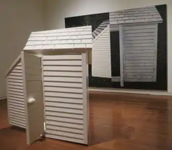 Her realistic works favored mundane subjects, such as modest houses.[10] Her installations often consisted of multiple canvases as well as three dimensional objects. House with Open Door from 1988, in the collection of the Honolulu Museum of Art, consists of an oil paint on canvas diptych and the same house constructed out of wood. The Dallas Museum of Art, the Honolulu Museum of Art, the Los Angeles County Museum of Art, the Metropolitan Museum of Art, the Museum of Fine Arts, Houston, the Museum of Modern Art (New York City), the Philadelphia Museum of Art, the San Francisco Museum of Modern Art, the Tate Modern, and the Whitney Museum of American Art (New York City) are among the public collections holding her work.[11]