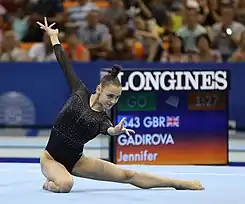 Jennifer Gadirova (born 3 October 2004) is an English artistic gymnast of Irish birth and Azerbaijani descent, representing Great Britain internationally.[4] She represented Great Britain at the 2020 Summer Olympics and won a bronze medal in the team event, and was part of the Great Britain team to win silver, their best ever result, in the team event at the 2022 World Artistic Gymnastics Championships and the same medal at the 2022 European Championships. Competing at the 2019 Junior World Championships, she won a silver medal in the vault final.[5]