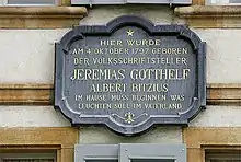 He spent the rest of his life in Lützelflüh, where he died, leaving three children (the son was a pastor, the two daughters married pastors).[1] During the 1840s, he steadfastly opposed radicalism and secularism and placed a conservative emphasis on piety and ecclesiastical authority.[3] There are lives of Bitzius by C. Manuel, in the Berlin edition of Bitzius's works (Berlin, 1861), and by J. Ammann in vol. i. (Bern, 1884) of the Sammlung Bernischer Biographien.