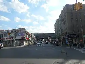 Jerome Avenue was put together as a plank road in 1874 for $375,000.[2] It appeared on maps as Central Avenue, because it started from Macombs Dam Bridge (Central Bridge) to Jerome Park Racetrack. Borough President Louis F. Haffen selected contractors in 1897 to pave Jerome Avenue. Three sections of the road were to be remodeled, costing the Bronx about $136,505.[3] The street was to be renamed after an unknown city alderman.[2] Kate Hall Jerome, wife of Lawrence Jerome, was furious, replacing all the signs with the name Jerome Avenue in honor of Jerome Park Racetrack opened by her husband's financier brother, Leonard Jerome in 1866. When the subway line was commissioned, Jerome went from rural road to commercial artery.