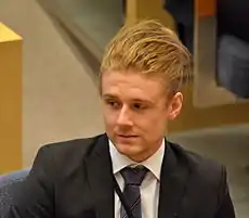 Jesper Jens Joakim Skalberg Karlsson (born 18 June 1993) is a Swedish politician of the Moderate Party. He was Member of the Riksdag from January 2015 to September 2018, representing his home constituency Gotland County.[1] He replaced Gustaf Hoffstedt who resigned his seat. He is also Baby of the House since taking office, replacing Dennis Dioukarev who is only 3 months older. He regained his seat in the 2022 general election.[2]