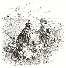 Robert Chambers collected and published Jock and his lulls, from Scotland, which was translated into French language as Jock et ses pipeaux by Louis Brueyre.[75] In this tale, two brothers named Jock try to make their fortune in the world and employ themselves as a hare-keeper to the king. The herd has a lame hare; the first Jock sacrifices it for food, which causes the king to hang him; the second Jock takes care of it and gets to marry the princess.[76]