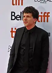 Eisenberg started writing screenplays at 16, some of which were optioned by major studios, but he claimed that he was dissatisfied with the lack of control he had over his creations once they were sold.[29] He once got into trouble with Woody Allen's lawyers when, as a teenager, he penned a play about how Allen came to change his name and managed to get the script to Allen's "people". Instead of a seal of approval, he received two cease and desist letters. Eisenberg later starred in two films directed by Allen, To Rome with Love[32] and Café Society.[33][34][35]