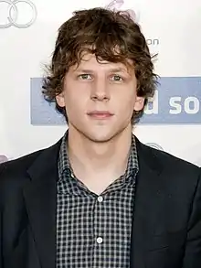 Eisenberg's first major box office success was a lead role in the horror-comedy Zombieland (2009). He starred opposite Woody Harrelson, Emma Stone, and Abigail Breslin as a group of survivors on a road trip through a post-zombie apocalypse America, and was a sleeper hit.[42] In 2010, he portrayed Facebook creator Mark Zuckerberg in the film The Social Network, for which he earned the Best Actor Award from the National Board of Review of Motion Pictures,[43] and nominations for Best Actor at the BAFTA Awards, Golden Globes, and Academy Awards but lost to Colin Firth for his performance of George VI in The King's Speech. According to the film's director, David Fincher, both he and screenwriter Aaron Sorkin knew Eisenberg was the one for the role as soon as they watched his audition tape, despite Eisenberg's own anxieties about his audition.[44] On November 22, 2010, Eisenberg was honored, along with Whoopi Goldberg, Joycelyn Engle, and Harvey Krueger, at the Children at Heart Celebrity Dinner Gala and Fantasy Auction, to benefit the children of the Chernobyl disaster. Steven Spielberg serves as chair of the event each year.[22]