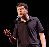 In 2015, Eisenberg portrayed Rolling Stone journalist David Lipsky in the biographical drama film The End of the Tour, appearing opposite Jason Segel, who portrayed the late author David Foster Wallace.[64] Eisenberg's third play, The Spoils, premiered off-Broadway in The New Group Perishing Square Signature Center Alice Griffin Box Theatre. The play featuring Eisenberg as Ben, also starring Kunal Nayyar, Michael Zegen, Erin Darke, and Annapurna Sriram, was the winner of The Blanche and Irving Laurie Foundation Theatre Visions Fund Award.[65] On September 8, 2015, Eisenberg released his first book, Bream Gives Me Hiccups, a collection of short humor pieces.[2][60]