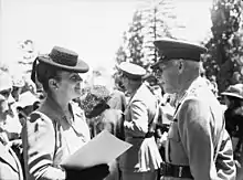 An investiture ceremony was held at Government House where service personnel received awards from the Governor-General of Australia, Field Marshal Prince Henry, Duke of Gloucester. Mrs Jessie Vasey, who received the CB, CBE, and bar to the DSO awarded to her late husband, talks with the Governor of Victoria, Major General Sir Winston Dugan.