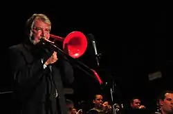 In more recent years, Whigham has been musical director of the RIAS Big Band in Berlin, Germany. He is formerly conductor of the BBC Big Band in Great Britain and currently co-director of the Berlin Jazz Orchestra with singer Marc Secara.[3][4][5] He is featured on the Berlin Jazz Orchestra albums Update, You're Everything, Songs of Berlin and music DVD (Polydor/Universal) Strangers In Night - The Music Of Bert Kaempfert. He was visiting tutor and artist at the Guildhall School of Music and Drama in London, the Royal Northern College of Music in Manchester and KUG in Graz, Austria.[2] He is artist-in-residence for the Conn-Selmer company, maker of the King Jiggs Whigham model trombone. He continues to tour worldwide as soloist, conductor, and educator. Since 2008 he has been a regular musical director for the Bundesjazzorchester working with the top student jazz musicians in Germany.