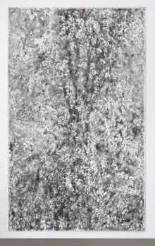 O’Bryan’s ground rubbings, or frottages, represent a more outward-focused aspect of her work.[4] She began these highly physical drawings in 2006 as a way to connect to and record her corporeal interactions with the New Mexico desert land.[5][2][25] They were made by laying out large sheets of white paper on the mesa, then lying on top of the paper and making rubbings with chunks of graphite to reveal impressions and pull out the texture of the rocks below.[6][13][26] Reviewers have likened these works (e.g., the 12-foot-tall, scroll-like Untitled #10, 2008 or NM.1.22, 2022), variously, to human skin or X-rays,[2] topographical maps or entire landscapes,[27][1] grave-rubbings,[28] and Australian Aboriginal drawings.[29] They have suggested that her mark-making in these drawings embeds the landscape into paper (rather than describing it), facilitating its organic emergence from the white surface.[5][29] Paul Ardenne described the marked paper as "both the surface of inscription and of exchange … equivalent to a situation of intercession: art makes nature speak, and nature makes art speak."[24]